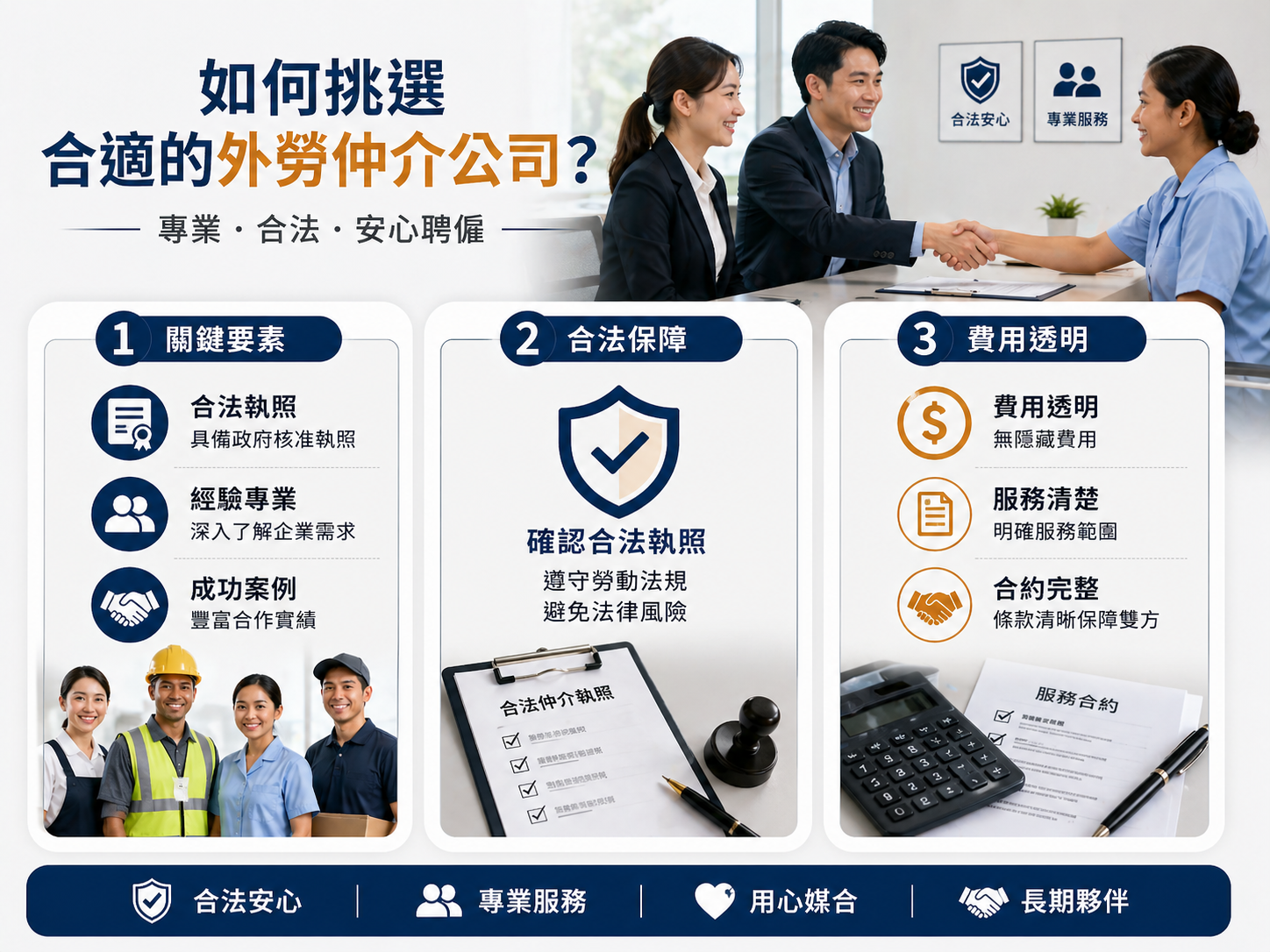 挑選外勞仲介時,最重要的是確認合法性、專業度與實際服務能力。企業應先了解仲介公司是否具備合法執照、是否熟悉相關申請流程、是否有服務同產業的經驗,以及是否能提供清楚的服務項目與時間規劃。