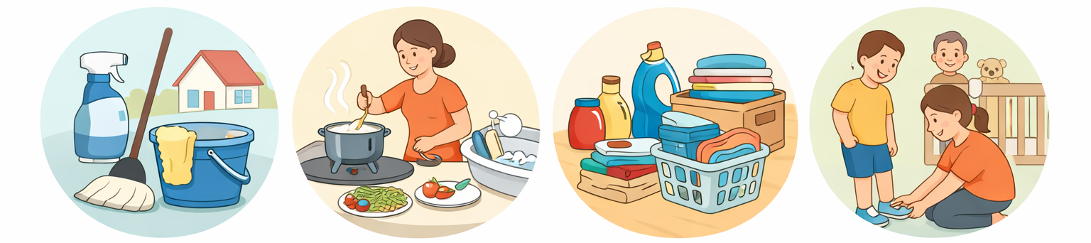 其工作內容以家庭日常生活事務為主,常見項目包括: